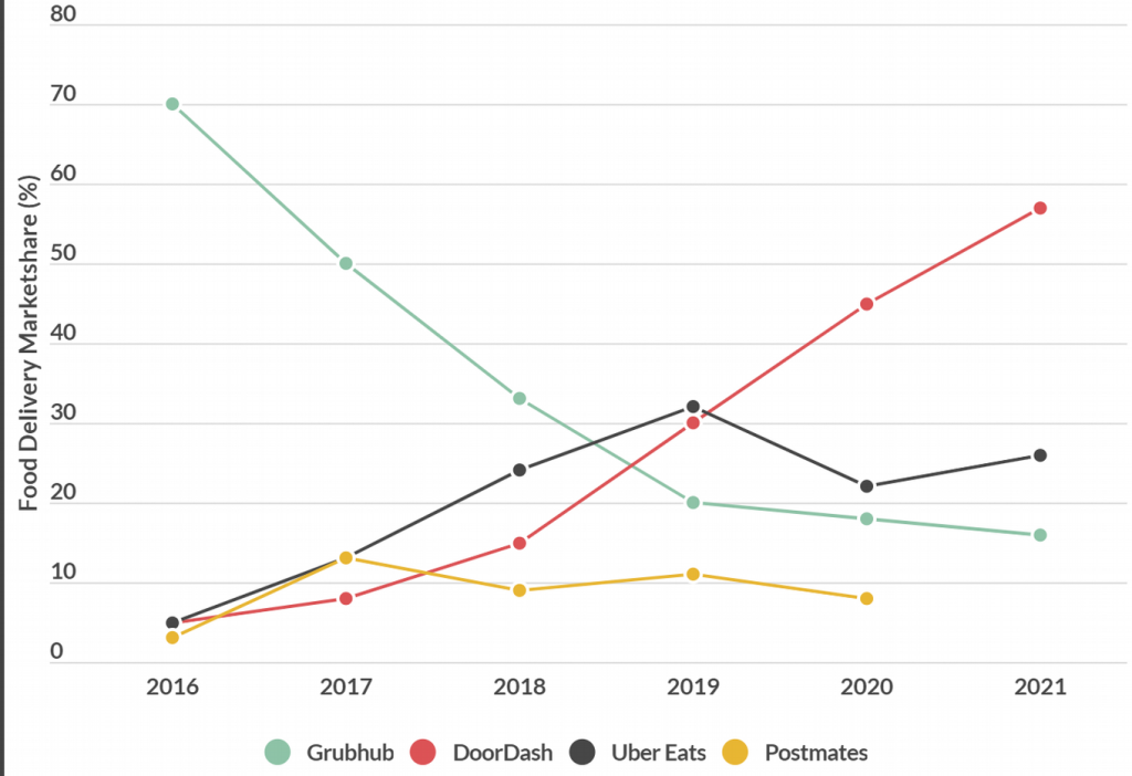 The Food delivery app users in the US are growing rapidly in the past 5 years. Let’s understand it by one survey report of McKinsey in which it shows the market share of various food delivery apps: